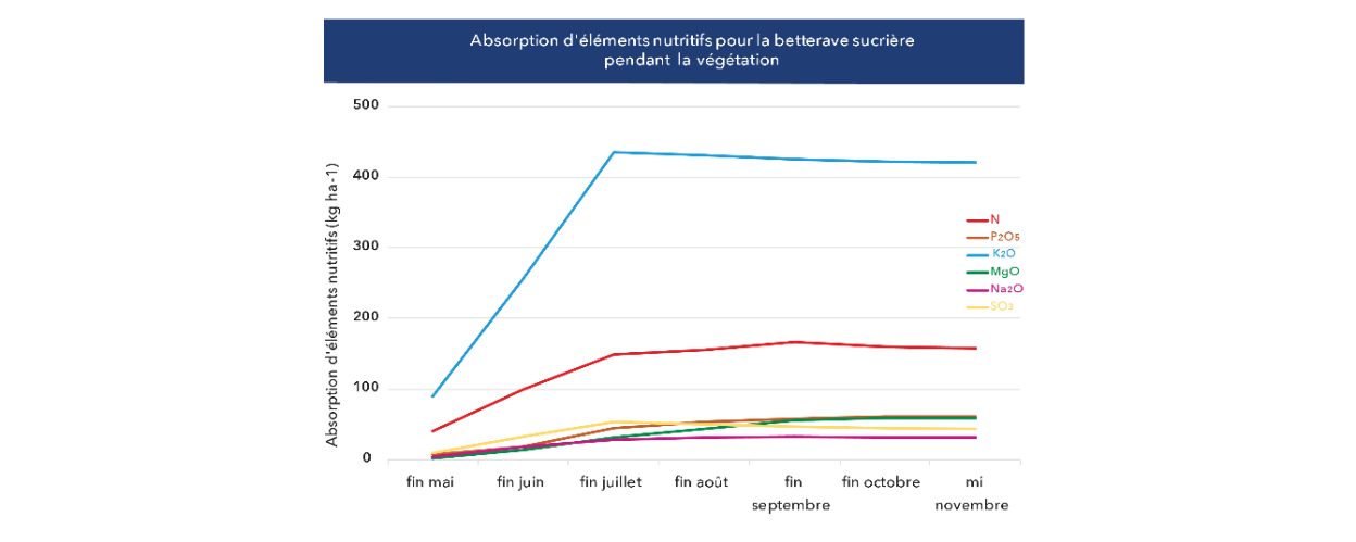 - Avec un niveau d’absorption en Potassium de 450-600 kg K2O/ha, le Potassium est l’élément nutritif le plus important pour la betterave.